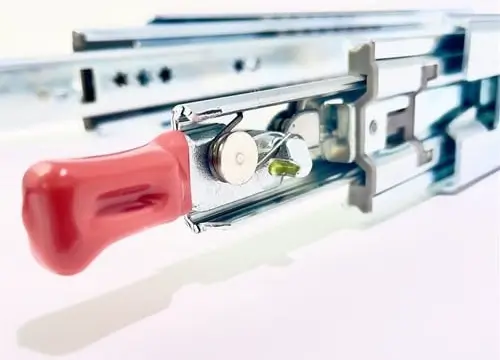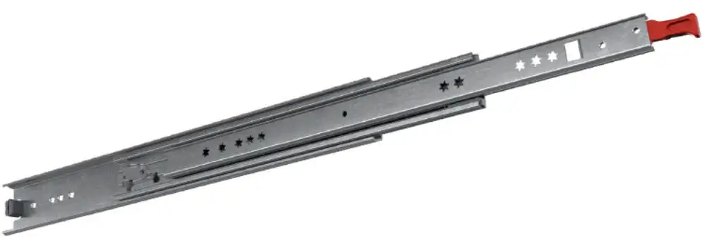 The UTILITY RED FULLY LOCKING slide has been developed for the emergency and commercial vehicle market to suit light to medium drawers and racking. It has a bright red front lever handle which disconnects and connects the locking facility in the closed and fully extended positions. This is a lightweight hollow section slide with a maximum 100kg load capacity at full extension. The slides are easy to fit with the locking device being integrated into the beams. A pair of 450mm long slides have been bench tested to 50,000 cycles with a 100kg load applied. These are highly recommended for lighter duty, pick-up and utility truck drawers which need to be locked in the stowed and fully extended positions via a front activated latch. UTILITY Red telescopic slides are sold as Left & Right handed pairs, so order one unit if a pair is required